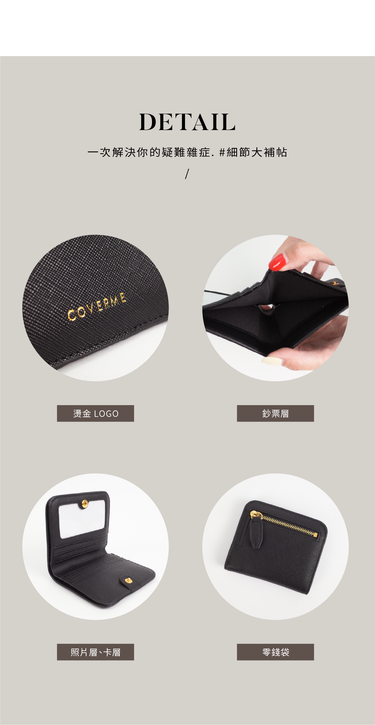 規格:卡層x4 照片層x1 夾層x2 拉鍊格x1 鈔票層x1